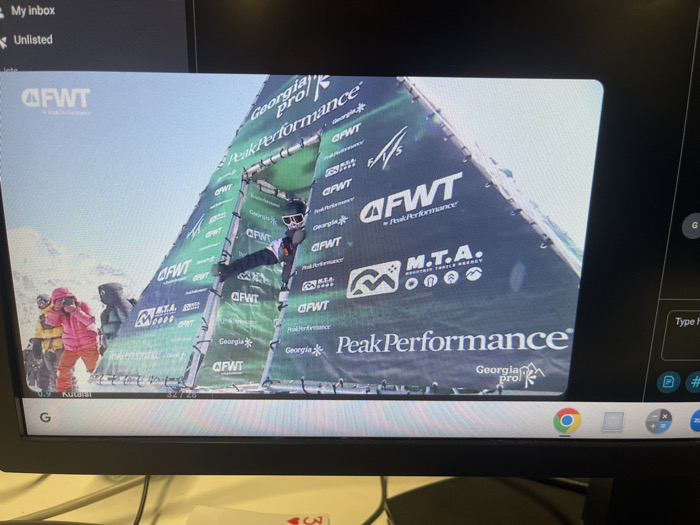 The image displays a photograph of a computer monitor showing a freeze-frame from a winter sports event. The scene is set on a bright, clear day in a mountainous ski environment, covered in snow, under a blue sky. At the center-right, a large, triangular banner structure, likely a gate or part of a course, dominates the foreground. This structure is covered with sponsor logos, prominently featuring "FWT by Peak Performance," "Georgia Pro," and "M.T.A. Mountain Travel Agency," alongside other smaller logos and a stylized mountain graphic. An individual, dressed in winter sports attire including goggles, a helmet, a dark jacket, and white gloves, is partially visible, appearing to emerge from an opening within the banner structure, holding onto a vertical support pole with their right hand. To the left of the banner, three other individuals are present, clad in heavy winter clothing of pink, yellow, and dark green jackets, standing on the snow, observing the action. The video frame itself contains digital overlays: a small "FWT" logo in the top left corner and text "0.9 Kutaisi 32 / 26" at the bottom left. The monitor's black bezel is visible, along with parts of the Chrome OS user interface, including icons on the taskbar at the bottom and Gmail labels ("My inbox," "Unlisted") at the top left. A chat window or search bar element with "G" and "Type here" is partially visible on the right side of the monitor screen. Below the monitor, a red playing card, specifically a 3 of hearts, is partially visible on a desk surface. The scene takes place in a mountainous ski environment within Georgia, characteristic of a ski resort. While the event is branded "Georgia Pro," the visual evidence of snow-covered peaks and ski slopes indicates a location outside the urban city of Tbilisi, Georgia, where such terrain does not exist within city limits.