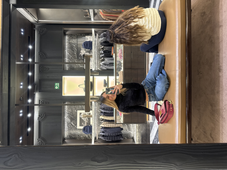 A mirrored perspective in a clothing store features two women seated on a tan bench. One woman, facing the mirror, is taking a selfie, wearing jeans and a black fuzzy sweater. Her purse rests next to her. The second woman, with long brown hair, faces away, wearing a white puffer jacket and dark pants. The store's interior reveals shelves displaying clothing items, with dark wood accents, recessed lighting, and marble flooring visible. A green emergency exit sign is also visible.