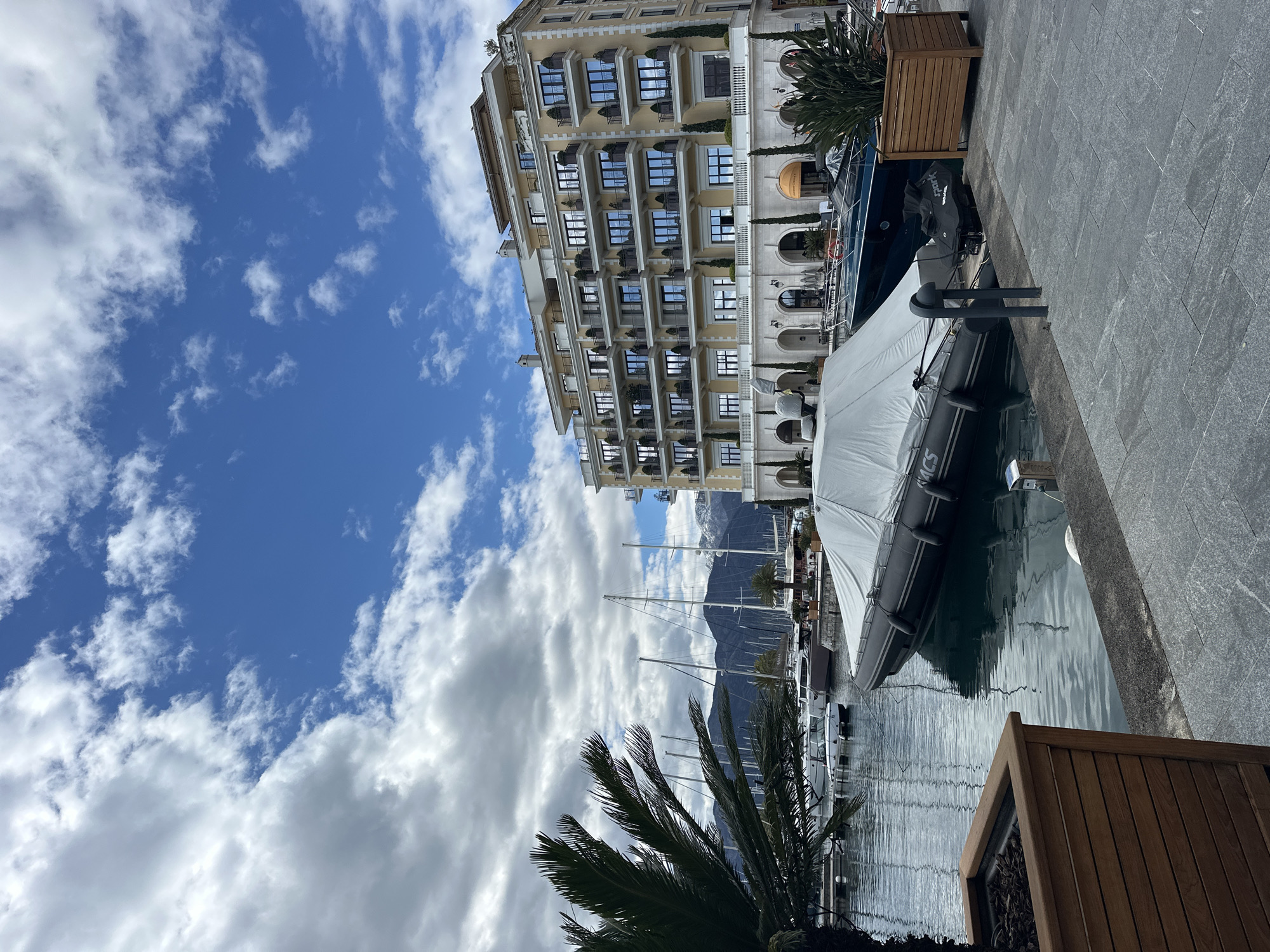 The image depicts a marina in Tivat, Montenegro, with a tall building in the background and boats docked in the water. The building has multiple floors and balconies with decorative elements. The sky is partly cloudy with patches of blue. In the foreground, there are boats of varying sizes, some covered. A paved walkway runs along the edge of the water, with wooden planters. Palm trees are visible on the side of the shot. The water in the marina reflects the sky and surrounding structures.