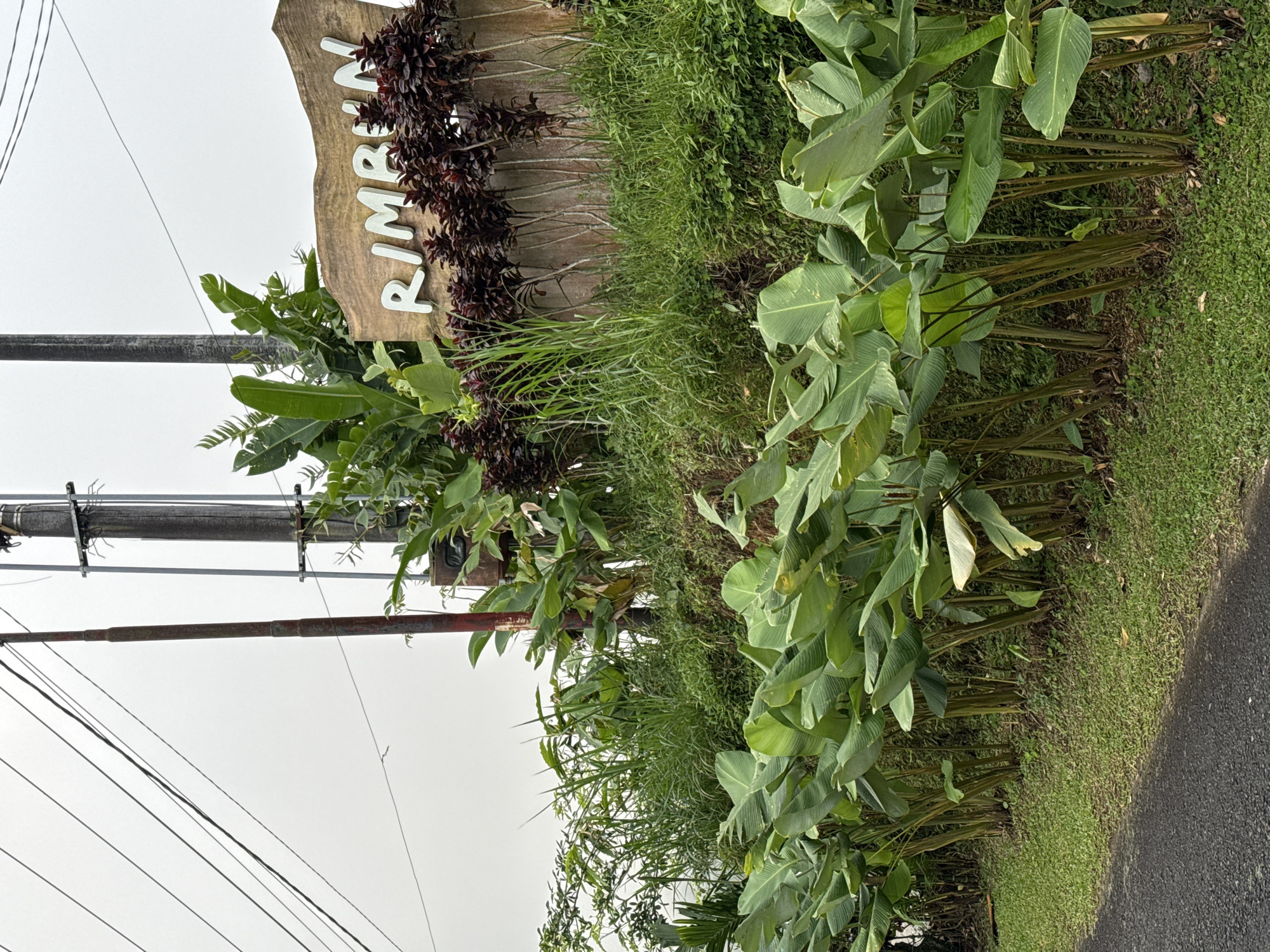 lush, verdant scene in Petang, Indonesia. A wooden sign with the word "RIMBUN" in white letters is partially visible, adorned with burgundy foliage. Dense layers of greenery dominate the foreground and midground, including broad-leafed plants resembling Canna lilies or similar tropical species. A row of these plants borders a dark asphalt road. Overhead, power lines are strung between utility poles. The sky is overcast.