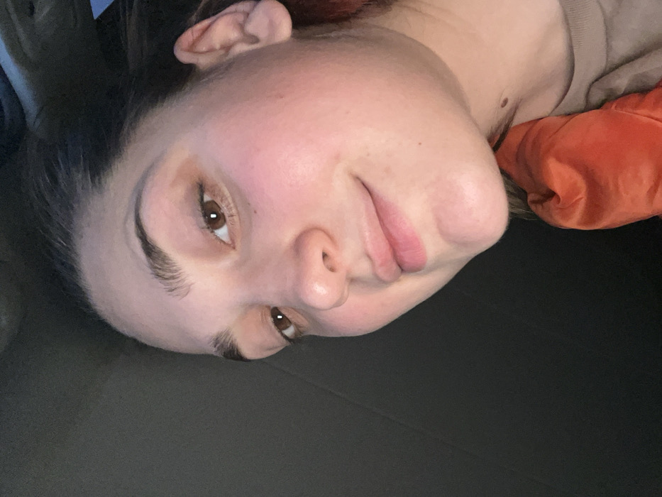 The image depicts a close-up, angled portrait of an individual in Vendenheim, France. The subject is a young adult female with fair skin, brown eyes, dark eyebrows, and dark hair pulled back. She has a subtle, closed-mouth smile. She is wearing a light-colored, possibly beige, top, and an orange garment, appearing to be a padded jacket or scarf, is visible over her right shoulder and neck. The background is dark and out of focus, suggesting an interior or low-light setting, possibly within a vehicle given the indeterminate dark texture on the left side. No other individuals, subjects, or specific objects are clearly discernible. The action is posing for a photograph. No direct interactions are visible.