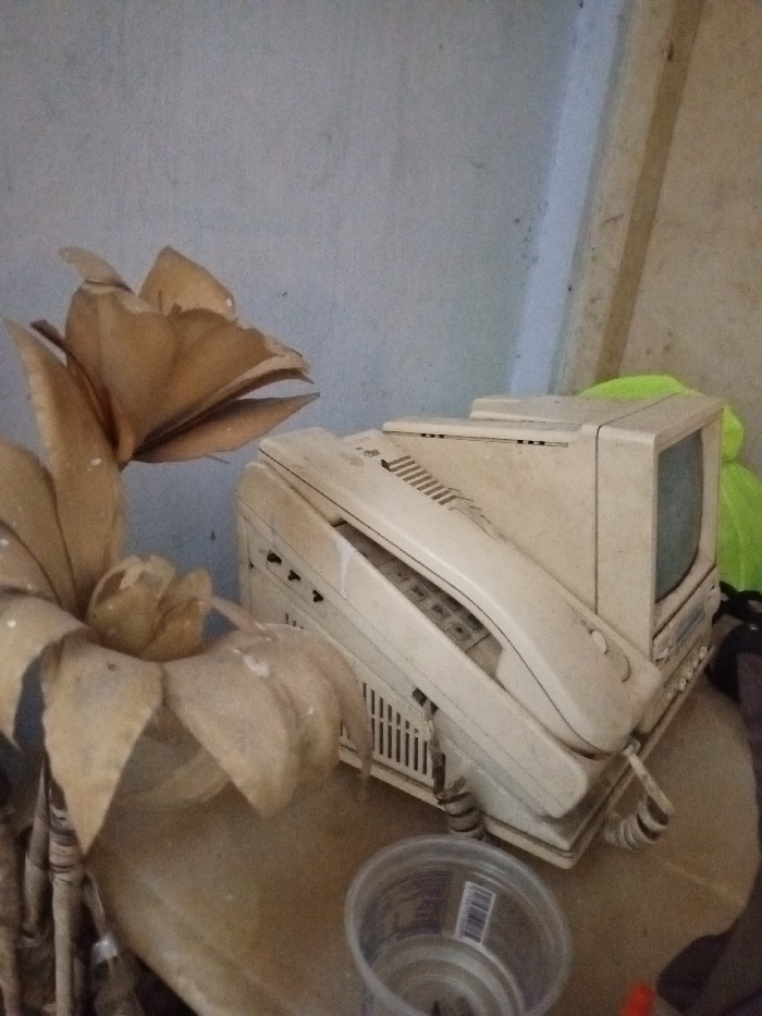 The image depicts an indoor scene in Keo Kouang, Laos, featuring a collection of aged objects on a light brown surface against a light-colored wall. In the left foreground, a large, dusty, faded beige artificial plant with multiple layered petals is prominently displayed. To its right, in the midground, an off-white combination telephone and fax machine is visible, with its handset resting on the main unit, revealing a numeric keypad and ventilation grilles. Immediately behind or stacked upon this device is a compact, off-white CRT monitor or television. A clear plastic cup with a barcode label is situated in the lower right foreground, containing a small amount of dark liquid or debris. The background consists of a light grey, textured wall showing signs of dust and discoloration, with a vertical wooden beam or frame partially visible on the far right. A bright, possibly neon green fabric or object is partially visible behind the electronic devices on the right.