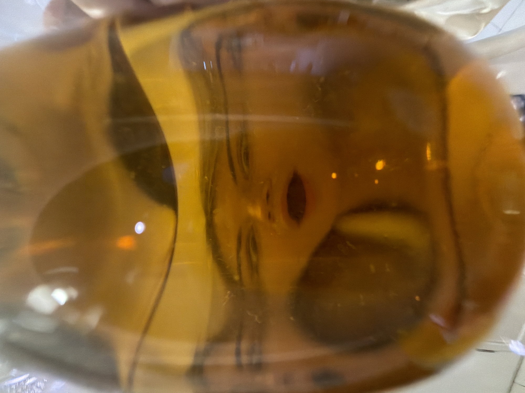 A blurred and distorted reflection of a person's face is visible through an amber-colored, translucent object