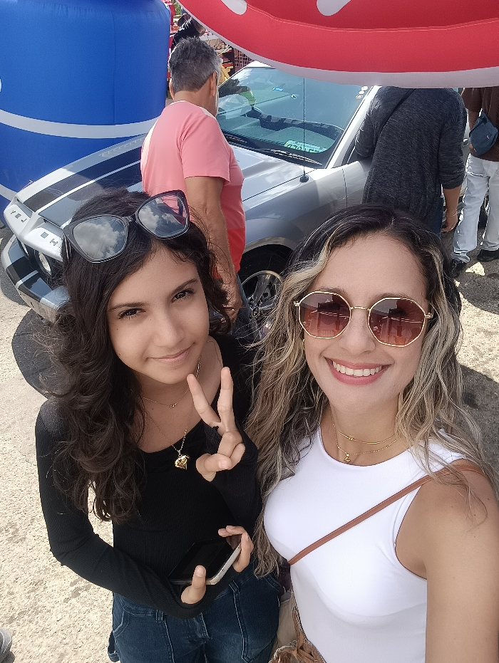 The image displays an outdoor scene in Carrizal, Venezuela, captured during daylight. In the foreground, two females are positioned for a photograph. The female on the right has long wavy blonde hair, wears a white sleeveless top, multiple thin gold chain necklaces (one with an 'L' pendant), and round, gold-rimmed mirrored sunglasses. She is smiling and looking directly at the camera. A thin brown strap diagonally crosses her torso. The female on the left has long dark wavy hair, wears a black ribbed long-sleeved top, dark blue jeans, and dark sunglasses perched on her head. She is also smiling towards the camera, holding a black smartphone with a metallic edge in her right hand and making a peace sign with her left hand. She wears two thin gold chain necklaces, one with a small pendant. In the mid-ground, a silver car, identified as a Ford Mustang due to its design and black racing stripes on the hood, is parked. An adult male with short grey hair, wearing a coral-colored t-shirt, is visible behind the car, facing away from the camera. Another adult male, wearing a dark grey long-sleeved shirt, is partially visible further to the right, also facing away. The background includes other partially visible individuals, indicating a gathering. The ground surface is light-colored and uneven. A large blue inflatable structure is visible on the far left of the frame. A red inflatable structure with white circular patterns extends across the top of the image. The scene suggests an outdoor event or car show.