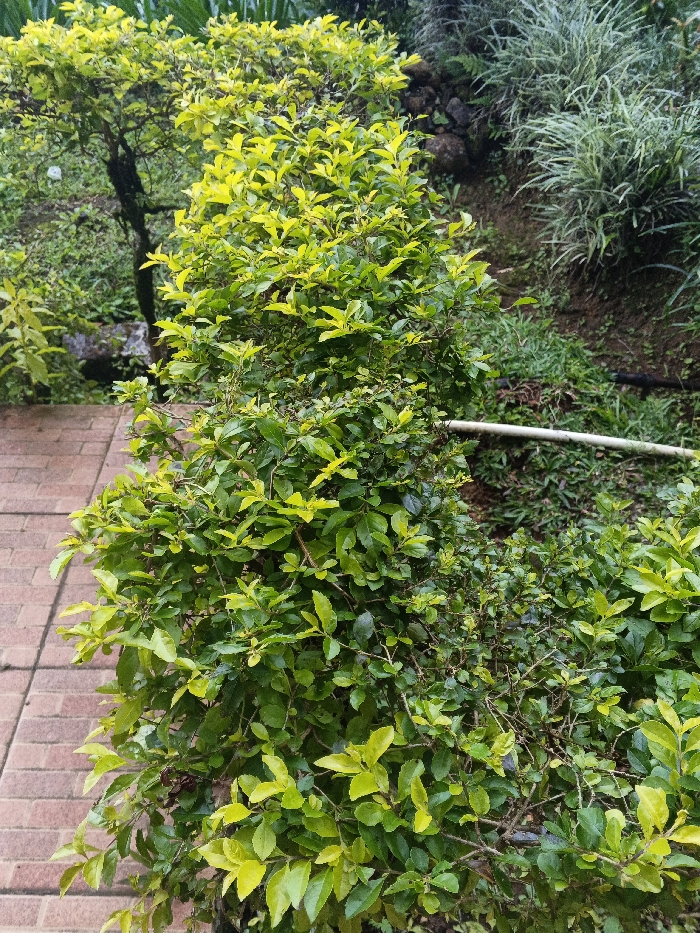 The image displays an outdoor vegetated scene. In the foreground and central area, a dense shrub with various shades of green foliage, ranging from light lime-green to dark green, is prominent. To the left, a section of a reddish-brown brick pathway, consisting of rectangular pavers, runs vertically. The background on the right features sloped terrain composed of exposed brown soil, interspersed with rocks and other plant life, including a bushy plant with variegated, light-colored leaves. A light-colored, possibly PVC, pipe lies horizontally across the mid-ground. In the upper-left background, a portion of a tree trunk with some green leaves is discernible. No individuals are present, and no specific actions or interactions are depicted. The location within the city of Akshatau, Kazakhstan, is not discernible from the visual information provided in the image.