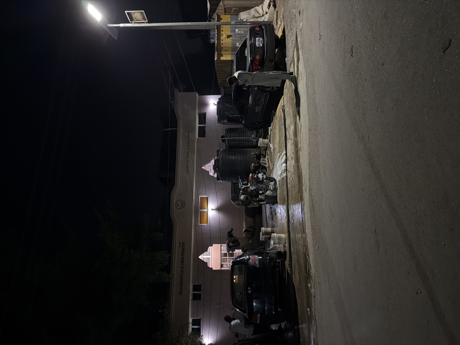 The image depicts a night scene on an asphalt road in Gandu Albasa, Nigeria, illuminated primarily by artificial light sources. In the background, a light-colored building with the English inscription "HALIS HAZARATU BIN AL TAHAMI FOUNDATION" and corresponding Arabic script is visible. The building features multiple rectangular windows, some illuminated with yellow light, and decorative elements on its facade. In the foreground and midground, a vehicle washing operation is in progress. On the left, a dark-colored sedan is being washed by two individuals. One person, wearing a white shirt, is positioned near the rear driver's side of the vehicle, holding a white bucket. Another individual is partially visible near the front passenger side. Several white buckets are on the wet pavement. In the center, a person is bent over a motorcycle, actively washing it. Multiple black, cylindrical water storage tanks are stacked behind this area. The ground around the washing activity is wet, reflecting the artificial lights. On the right side of the frame, another dark-colored sedan is parked. A male individual, dressed in a light-colored thobe or kaftan, stands near the rear passenger side of this vehicle, looking down at a small object in his hands, consistent with operating a mobile phone. A tall street light with a solar panel attached is positioned on the far right, casting bright light onto the scene. Power lines are visible against the dark night sky above the building. To the far right, beyond the parked sedan, what appear to be yellow corrugated metal structures or shipping containers are visible.
