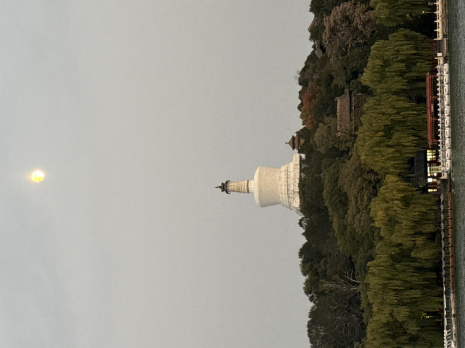 The image displays the White Dagoba (Baita) on Qionghua Island within Beihai Park, Xicheng District, Beijing, China. A large, white, bottle-shaped Buddhist dagoba with a tiered base and a spire dominates the upper-middle ground, situated on a densely forested hill. The foliage consists primarily of dark green trees and shrubs, with some areas showing reddish-brown autumn coloration. Scattered among the trees on the hill, particularly to the right of the dagoba, are smaller traditional Chinese architectural elements with dark tiled roofs. Above the hill, a bright, spherical, yellowish-white celestial object, likely the moon, is visible against a muted, light grey overcast sky. The foreground features a body of water, part of Beihai Lake. Along the water's edge, a white, low-profile pier or walkway runs horizontally, mooring multiple rows of small recreational boats, predominantly white with some featuring red elements. A small, dark-roofed traditional Chinese pavilion with visible interior lighting is positioned at the waterfront, partially obscured by green weeping willow trees. No individuals are visible in the scene.