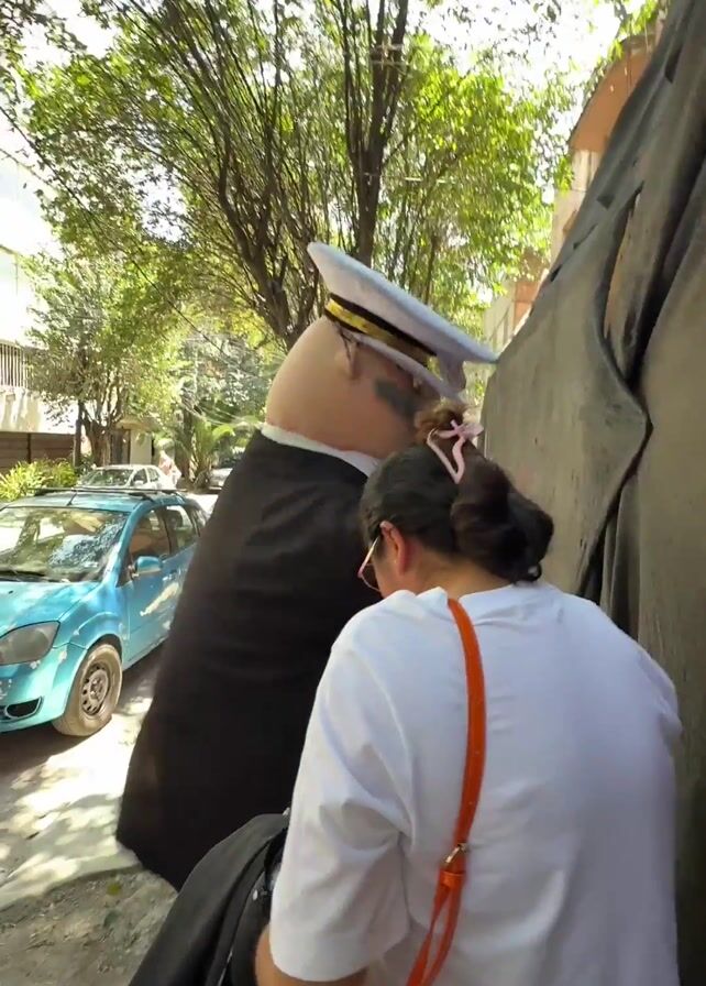 A person wearing a black naval officer uniform and large character mask walks on a sidewalk next to a woman wearing a white shirt. The person is touching their mask and the woman is looking at them. A second woman in a blue and white uniform walks alongside the character. A blue car and trees are visible in the background. A black tarp covers a wall or barrier to the right of the group.