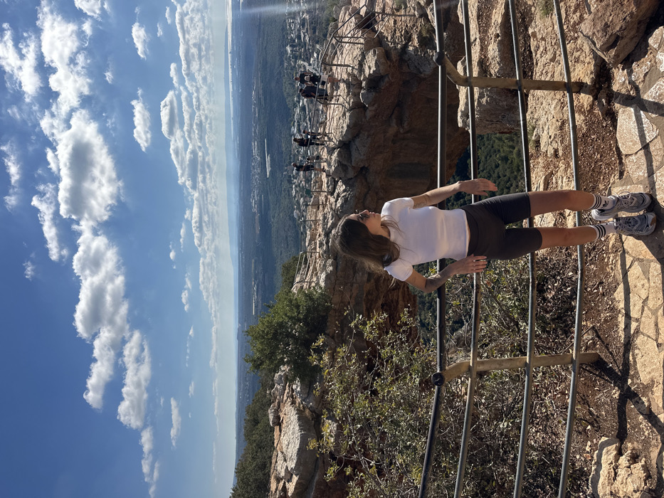 The image captures a panoramic view from a cliffside observation point at Keshet Cave in the Maale Yosef Regional Council, Israel, under a bright blue sky with scattered white cumulus clouds. In the immediate foreground, a female subject stands on a light-colored, irregularly paved stone path. She wears a white short-sleeved crop top, dark gray cycling shorts, white athletic socks with black stripes, and gray sneakers, leaning with both hands on a multi-barred dark metal safety railing. Her brown hair is down, she wears sunglasses, and tattoos are visible on her left arm. Her head is turned to the right, observing the distant landscape. Behind her and slightly to the right, the distinctive natural rock arch formation of Keshet Cave is visible, with a dark, shaded opening beneath it. Further to the right, on a lower rocky outcrop also equipped with dark metal safety railings, a group of approximately five to six individuals can be seen standing and looking out over the expansive view. The midground and background consist of a vast valley covered with dense green vegetation, scattered buildings, and urban areas. On the distant horizon to the right, a body of water, identifiable as the Mediterranean Sea, is visible alongside what appears to be coastal cities and industrial structures, all under a slight atmospheric haze. Rocks and sparse green bushes are present on the upper left and mid-left portions of the cliff face.