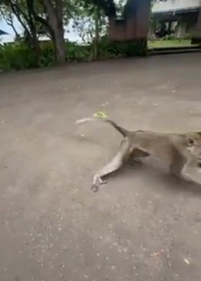 A man is feeding a monkey a piece of food on a paved road surrounded by lush greenery. The monkey, which is light brown with a long tail, reaches out and takes the food from the man's hand, then scurries away toward a sign that reads "The Octagon." The sign is situated at the entrance to what appears to be a resort or hotel property. The monkey then disappears down the paved road lined with trees.