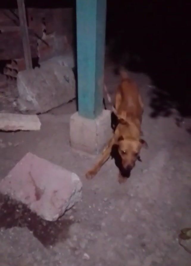 medium-sized, brown dog acting aggressively in what appears to be an outdoor setting at night. The dog is barking loudly and jumping. There is a turquoise-colored pillar with a concrete base, as well as large, rectangular stones, and miscellaneous construction materials in the background. The lighting is poor, making it difficult to discern further details of the surrounding environment.