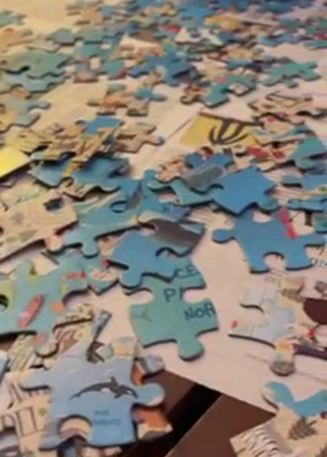 - "close-up of a partially completed jigsaw puzzle spread out on a table covered with newspapers" by FM-E1hwL2, licensed under CC BY 4.0