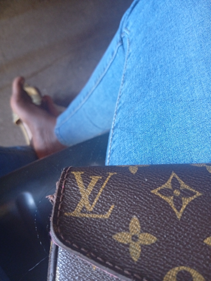 A person in light blue jeans sits with crossed legs. A brown wallet or small bag with a repeating gold "LV" logo pattern sits on top of the lap. A foot in a sandal is visible in the background, slightly out of focus. The setting appears to be indoors with a plain, possibly concrete or tiled, floor. The image focuses on the Louis Vuitton-patterned item, with the person's leg and foot providing context.