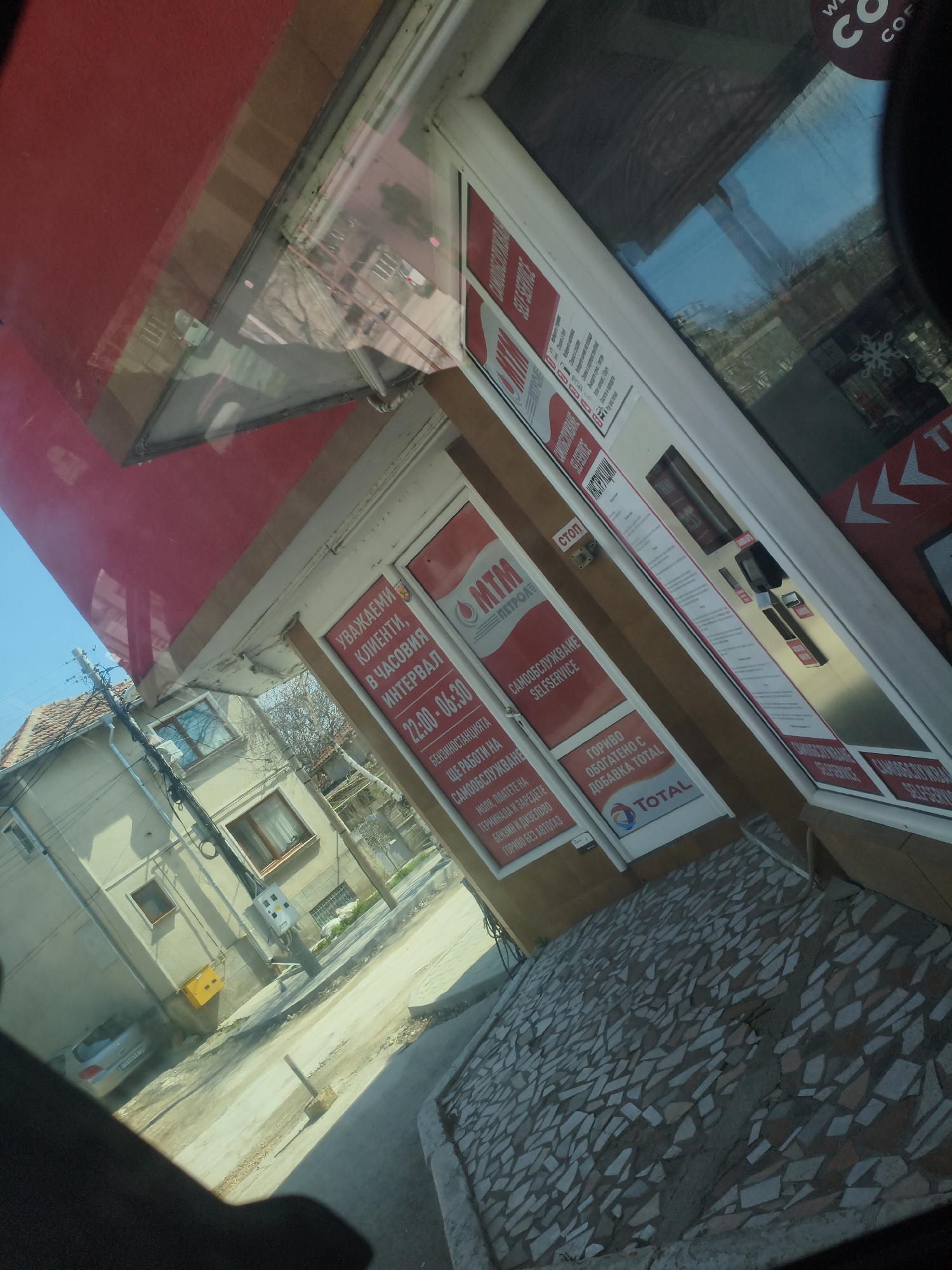 The image displays a tilted, outdoor urban scene observed through a reflective window, likely from a vehicle, in Dobrich, Bulgaria. The primary subject is a commercial building on the right, featuring a red awning. Its glass facade displays multiple red and white signs with Cyrillic text. Key visible information includes "MTM PETROL" and "САМООБСЛУЖВАНЕ SELFSERVICE", alongside an operational interval of "22:00 - 06:30". A "TOTAL" logo is present on another sign, mentioning "enriched fuel". A payment terminal is visible behind the glass. Reflections on the glass include a partial "COSTA COFFEE" logo and a white snowflake design. The ground directly in front of this building is paved with irregular, multicolored mosaic tiles. Across a narrow, dirty, and poorly maintained road in the midground, a light-colored, multi-story residential building with a tiled roof is visible. It features several windows and has a yellow utility box and a white electrical panel mounted on its exterior. Utility poles and overhead wires are present near this building. A silver sedan, possibly a Peugeot (partial license plate "A 5664 AX"), is parked on the left side of the road, adjacent to the residential structure. The sky is clear blue, and trees with bare branches are visible, suggesting a late winter or early spring season. No individuals are visible, and no active interactions are depicted.