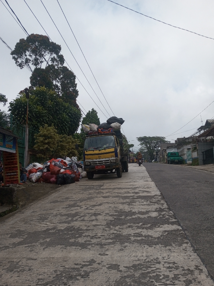 This image depicts an outdoor street scene in the city of Nuwara Eliya, Sri Lanka, under an overcast sky. The foreground shows a textured concrete shoulder/sidewalk on the left, merging into an asphalt road on the right. A yellow medium-duty truck, bearing a license plate displaying 'T 8359 U', is positioned on the concrete surface, facing the viewer. The truck's cargo bed and roof are heavily laden with various items, including white sacks, black tarps, and other multi-colored bags. To the immediate left of the truck, on the concrete shoulder, a substantial accumulation of waste materials within numerous plastic bags, predominantly red, white, and black, is present. A partially visible individual is seated near this pile on the far left, adjacent to a structure with a blue and orange sign. Further down the asphalt road, a person on a motorcycle is observed moving away from the viewer. On the right side of the road, a green pickup truck is parked in front of residential buildings. The left side of the scene features dense green foliage, including tall trees with reddish-brown upper leaves, and a green metal fence. Overhead utility lines traverse the upper portion of the frame.