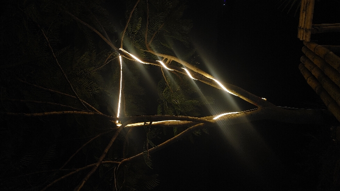 The scene is captured at night in Purbachal, Bangladesh. A tree with multiple prominent branches, largely devoid of foliage in its illuminated sections, occupies the central frame. Warm white rope lights are wrapped around these branches, illuminating them brightly. The lights form an approximate triangular configuration in the upper central area of the tree and spiral downwards along other primary branches. Dark foliage is partially visible behind and between the illuminated branches. In the lower right foreground, a structure composed of horizontal bamboo poles is partially visible. The immediate environment beyond the illuminated tree and bamboo element is dark. No individuals are present.