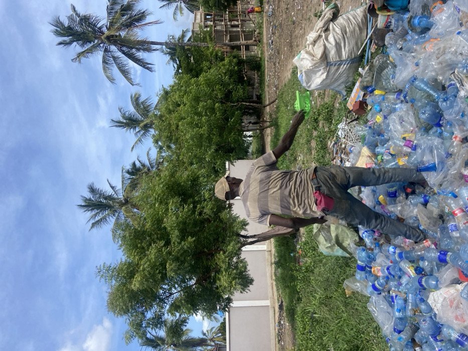 An outdoor scene in an urban or peri-urban area of Dar es-Salaam, Tanzania, captured under a clear blue sky with scattered white clouds. A dark-skinned male individual, viewed from the back, stands centrally on a large mound of discarded clear and blue plastic bottles. He wears a tan baseball cap, a striped tan and off-white short-sleeved t-shirt, blue jeans, and has a red pouch or cloth tucked into his right rear waistband. His right arm is extended forward and slightly to the left, holding a green, scoop-like plastic object. To the right of the plastic bottle pile, a large white woven sack rests on the ground. The immediate ground cover is a mix of dirt, sparse green vegetation, and additional debris. In the midground, to the left, a light grey concrete wall with a white top edge demarcates a property boundary. Behind this wall and further to the right are several lush green tropical trees. A dirt path extends into the background, where a multi-story building under construction, featuring exposed concrete and scaffolding, is visible on the far right. A second individual, dressed in a yellow top and dark bottoms, is discernible near the construction site. Numerous tall palm trees are scattered across the background, rising above the foliage and structures.