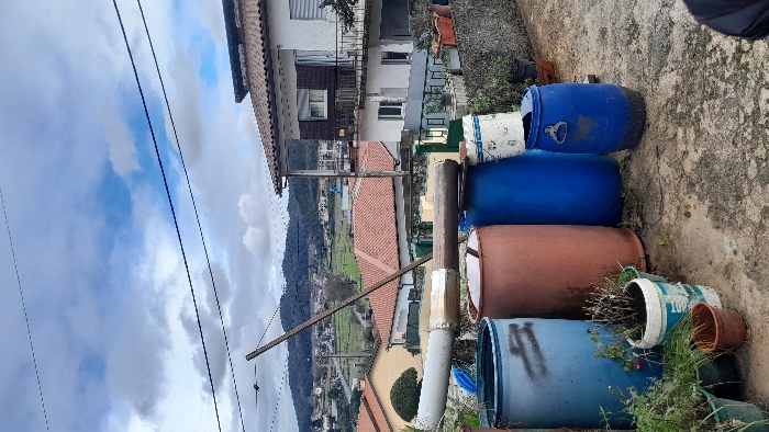 The image depicts an outdoor residential scene in Vila Nova de Famalicão, Portugal, under a partially cloudy sky. In the immediate foreground, a concrete ground surface is visible. Arranged on this surface are four plastic barrels: two large blue, one large reddish-brown, and one smaller blue barrel. Multiple potted plants, in various containers including green plastic pots, a terracotta pot, and a white plastic bucket, are situated on the ground. A large, cylindrical object, resembling a stylized brush with a white conical tip, a metallic band, and a dark, textured body, rests horizontally across the tops of some of the larger barrels. A wooden pole extends diagonally from the midground upwards and left, crossing multiple overhead utility lines. The midground showcases a residential area with numerous houses featuring red tiled roofs and light-colored facades. A prominent multi-story white house on the right includes balconies with iron railings and windows, some equipped with closed shutters. Green fields are interspersed among the buildings. The background is dominated by forested hills under a blue sky with scattered white cumulus clouds.