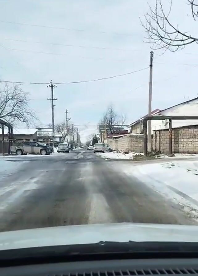 view from inside a vehicle driving on a snow-lined street. The road is wet and slushy, with patches of snow and ice. The surroundings consist of low buildings, houses, and fences, all lightly covered in snow. Utility poles with power lines run alongside the road. The sky is overcast, suggesting a cold winter day. The vehicle appears to be moving slowly. There are other parked vehicles along the roadside. The scene conveys a quiet, somewhat desolate winter landscape in a residential area.