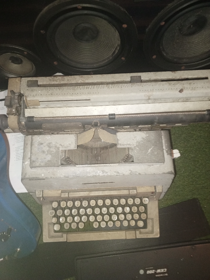 An old, dusty typewriter sits beneath a speaker system. The typewriter has a standard keyboard layout and a carriage with visible print heads. It's worn and shows signs of age. The speakers above vary in size, with three visible and a dark, possibly worn-out appearance. A blue object and a black case with text are present on the periphery of the image. The lighting is poor and the background is murky.