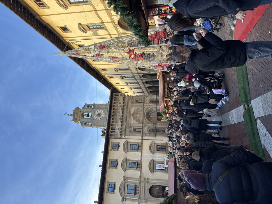 The image captures a crowded outdoor scene in Piazza Grande, Arezzo, Italy, under a clear blue sky with scattered wispy clouds. The central-left background features the Palazzo della Fraternita dei Laici, distinguished by its ornate architectural facade and a prominent clock tower with a bell housing. The clock face indicates approximately 12:45. To the right, a section of the Palazzo delle Logge del Vasari is visible, characterized by its arched arcade on the lower level. The square is densely populated with a diverse crowd of people, including adults, children, and individuals pushing strollers, all dressed in various winter coats, hats, and scarves. The environment suggests a festive market setting, with numerous wooden stalls lining the square, adorned with Christmas garlands. A prominent, tall, conical Christmas tree structure, composed of a light-colored framework internally lit and decorated with red star-shaped elements, stands in the midground to the right. Individuals are observed walking, standing, and interacting within the bustling market. In the immediate foreground, a man with a beard, wearing a dark jacket, is holding small white objects in his hands. A white-and-grey patterned dog is visible on a leash near a group of people and strollers in the midground. The ground is paved with geometric tiles, interspersed with rectangular sections of green matting. The natural sunlight illuminates the buildings and parts of the crowd, indicating daytime.