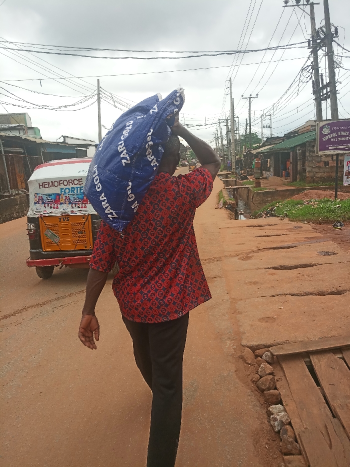 An adult male is observed from behind, walking on a reddish-brown unpaved street under an overcast sky in Onitsha, Nigeria. He wears a red short-sleeved shirt with a circular pattern and dark trousers. He carries a large, bulging blue sack, marked with "ZARA GOLD" in white lettering, balanced on his head and supported by his raised left hand. To his left, the rear of a yellow and black TVS brand tricycle (keke napep) featuring "HEMOFORCE FORTE" advertising is partially visible. The right side of the street includes an uneven concrete pavement, an open drainage ditch, and a segment covered by wooden planks. Beyond this, a row of single-story buildings with corrugated roofs and a "SUPREME KINGS" signboard are present. Numerous utility poles and a dense network of overhead wires are visible along the street, receding into the distance.