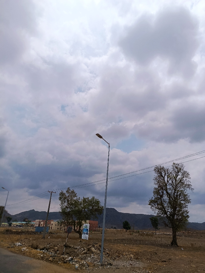 The image depicts an expansive, dry landscape in Rafin Pa, Nigeria, under a heavily clouded sky with a small visible patch of blue. In the foreground, an unpaved dirt road is visible on the left, transitioning to reddish-brown, uncultivated ground with scattered rocks and debris. Two streetlights are present: a prominent grey metallic pole with a luminaire is slightly right of center, and another shorter pole with a luminaire is on the far left. At least two wooden utility poles with multiple black lines span the mid-ground. A white sign with "25 KPH" and "SPEED LIMIT" is visible on a pole near the center-left, alongside a vertical banner-like sign. Vegetation includes a large, mature tree on the right and a smaller, bushy tree left of center. In the mid-ground, multiple light-colored, multi-story buildings are situated at the base of distant hills or mountains that form the horizon. No individuals are visible, and no active human interactions are depicted.