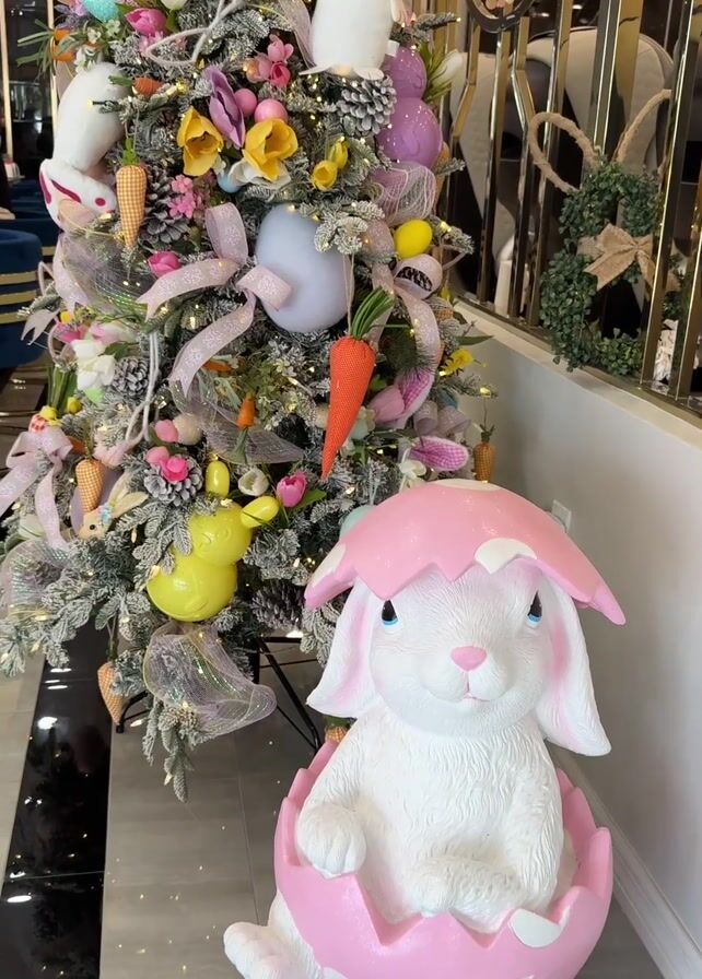 The video showcases an Easter-themed Christmas tree and accompanying bunny decoration