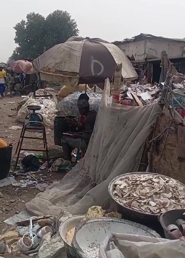 The video depicts a crowded outdoor space, seemingly a market or recycling depot, in what appears to be a developing country