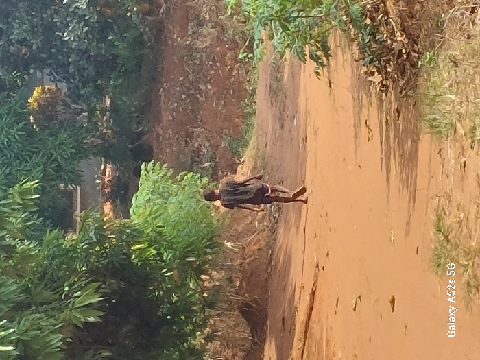 The image depicts an outdoor scene in Umudioka, Nigeria, during daylight. A solitary individual, appearing to be a young person, is seen from behind, walking away from the camera along a reddish-brown dirt path. The individual wears a dark-colored t-shirt and dark shorts, with either bare feet or dark, minimalist footwear. The path, visible in the foreground and extending into the midground, is composed of reddish-brown earth and appears somewhat uneven, with small shadows or debris scattered across its surface. Lush green foliage, primarily trees and dense bushes, frames the path on both sides. On the left, the vegetation is dense and tall, casting shadows onto the path. On the right, the foliage is sparser and lower to the ground, interspersed with patches of reddish-brown earth. The background consists of more dense green vegetation and visible reddish-brown terrain, suggesting a natural, possibly undulating landscape. Bright natural light illuminates the scene, creating distinct shadows. A "Galaxy A52s 5G" watermark is present in the lower-left corner of the image.