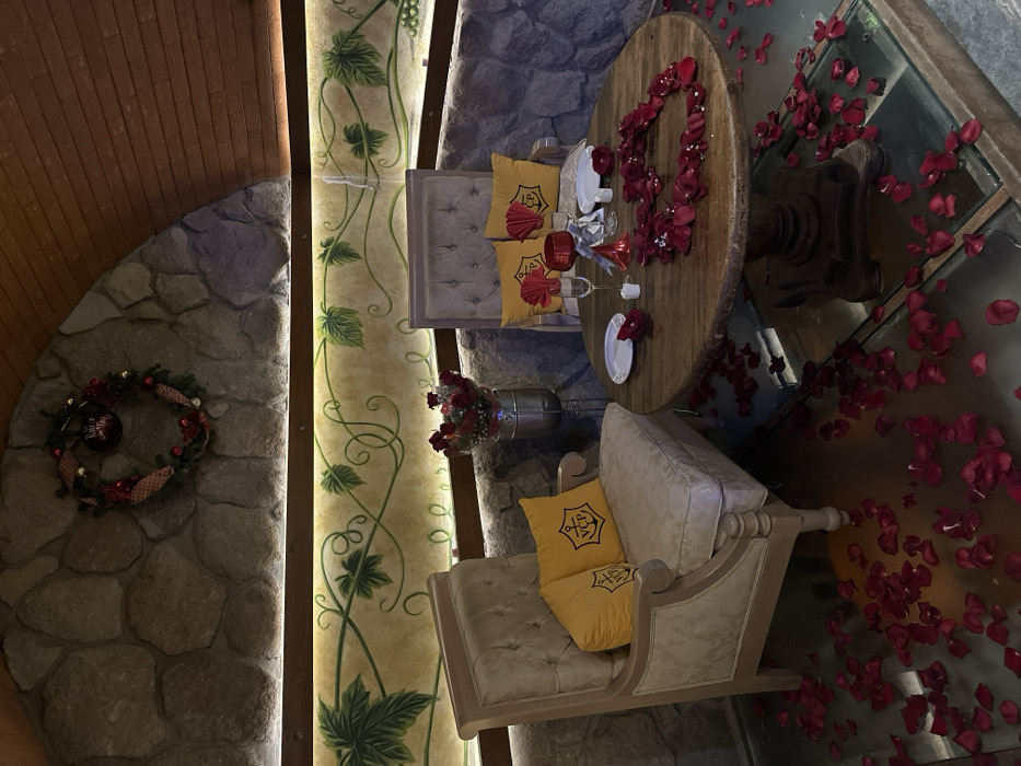 An intimate dining setup includes a round wooden table adorned with rose petals forming a heart shape. Two luxurious chairs with yellow logo pillows face each other. Red rose petals are scattered around the table and across a transparent glass floor revealing the space below. A floral arrangement sits between the chairs. A stone wall with a decorative wreath and grape vine pattern adds to the romantic ambiance.