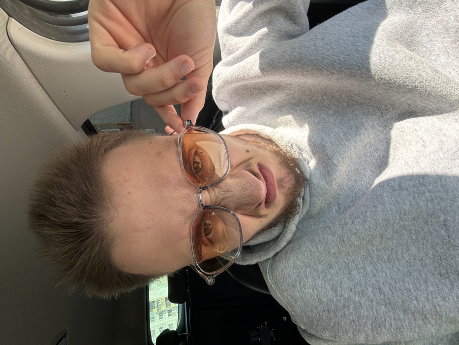 A male individual is depicted in a vehicle interior during daylight hours in Radomir, Bulgaria. The subject has short, light brown hair and light brown facial stubble. He wears clear-framed glasses with amber-tinted lenses, and his left hand is positioned to grasp the left temple of the glasses, with the thumb and index finger. His face displays a grimace, characterized by a wrinkled nose and downturned mouth. He is attired in a light grey hooded sweatshirt, illuminated by strong, directional sunlight. In the background, visible through the vehicle's rear window, is a multi-story residential building with balconies. An "AIRBAG" label is present on the vehicle's interior ceiling paneling above the subject's right shoulder.