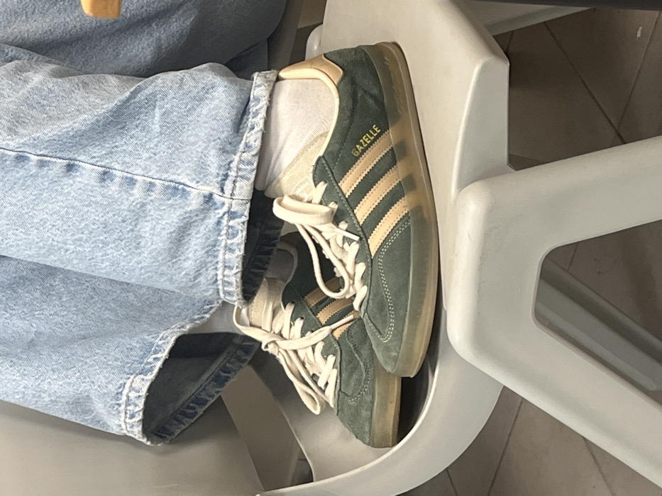 This image depicts a close-up view of a person's lower legs and feet, resting on a light grey plastic chair in an indoor setting within Ness Ziona, Israel. The individual wears light blue denim jeans, white ankle socks, and a pair of dark green suede Adidas Gazelle sneakers with light tan stripes and heel tabs. The shoes feature off-white laces and translucent, amber-toned rubber soles. "GAZELLE" is embossed in gold lettering on the lateral side of the right shoe. The floor beneath the chair appears to be tiled. No other individuals or specific environmental details beyond the chair and floor are clearly discernible.