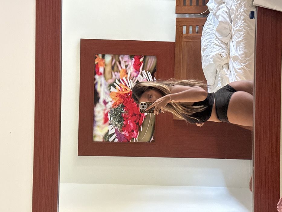 A female individual is captured in a mirror selfie inside a room located in Uluwatu, Indonesia
