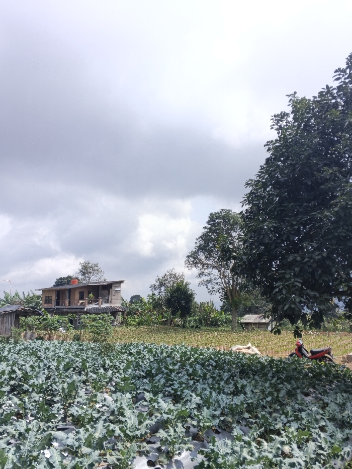 A rural scene under a cloudy sky features a field of low-lying leafy plants in the foreground. A two-story house with a brick chimney stands amidst other structures and trees in the midground. To the right, a large tree dominates, partially obscuring a red motorcycle parked nearby. In the distance, the landscape appears to rise slightly, merging with the cloudy horizon.