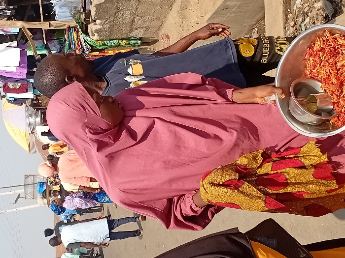 A man and woman stand in what appears to be a marketplace. The man is wearing a blue t-shirt. The woman is wearing a pink hijab and a yellow and red patterned shawl or top over her arm. She holds a large metal bowl filled with what may be dried peppers, as well as a smaller metal container. Other people are visible in the background, and an umbrella and market stalls suggest an outdoor setting.