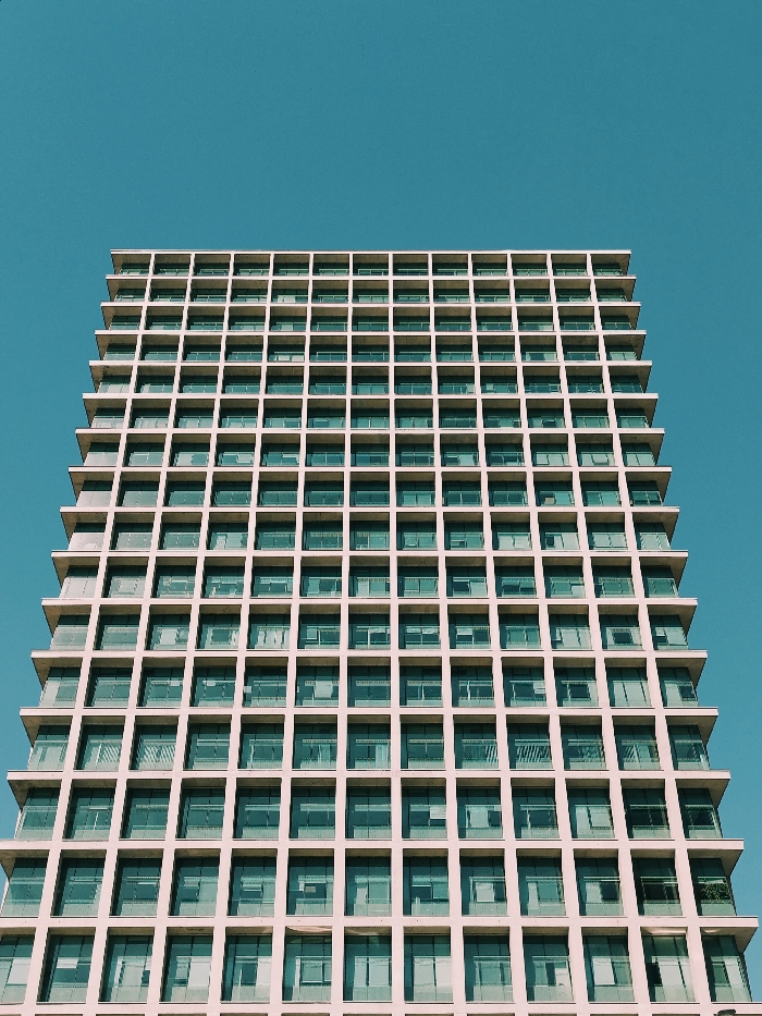 - "A tall, modern building with a grid-like facade is prominently featured against a clear blue sky" by FM-ZqBmD2, licensed under CC BY 4.0