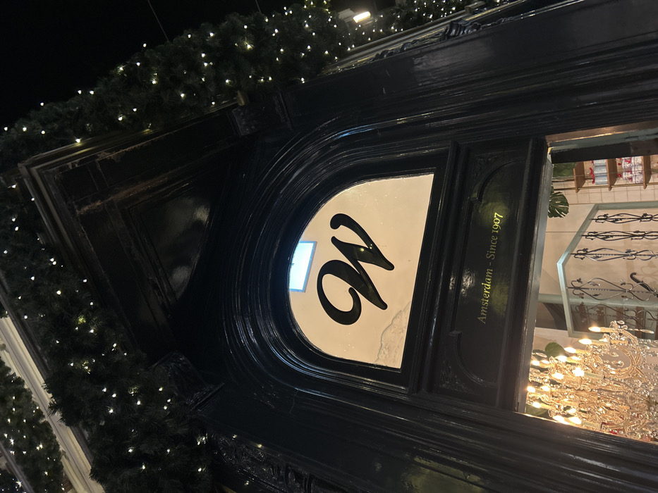 A low-angle, close-up shot reveals a dark, ornate storefront window. A large, stylized "W" dominates the glass, with the inscription "Amsterdam - Since 1907" to its right. Christmas lights adorn the exterior. Through the window, a glimpse of the store interior features decorative items and a chandelier. The scene is dominated by the black window frame, its curves and details highlighted by the lighting.