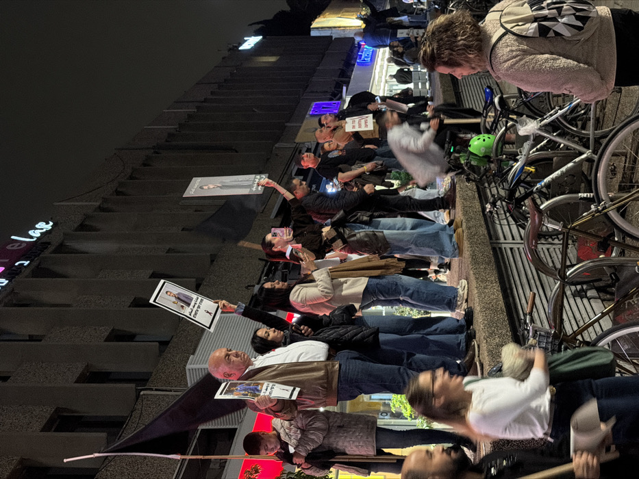 A group of people is protesting. They are holding signs with photos. The protesters are standing near a building with neon lights and a row of parked bicycles. The protest seems to be taking place at night. Some people are wearing casual clothes, such as jeans and jackets. There is a black flag on a pole.