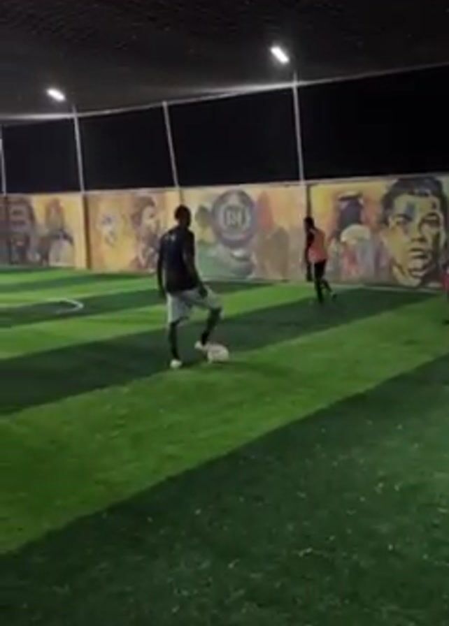Several people are playing soccer on a green turf field inside a fenced-in area with netting overhead. The players are wearing various athletic clothing, some with orange vests. There is a white soccer ball on the field. A mural of faces is painted on the wall behind the field. Overhead lighting illuminates the area. The camera moves slightly to follow the action.