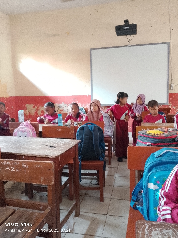 A classroom setting shows children seated at desks, most with backpacks