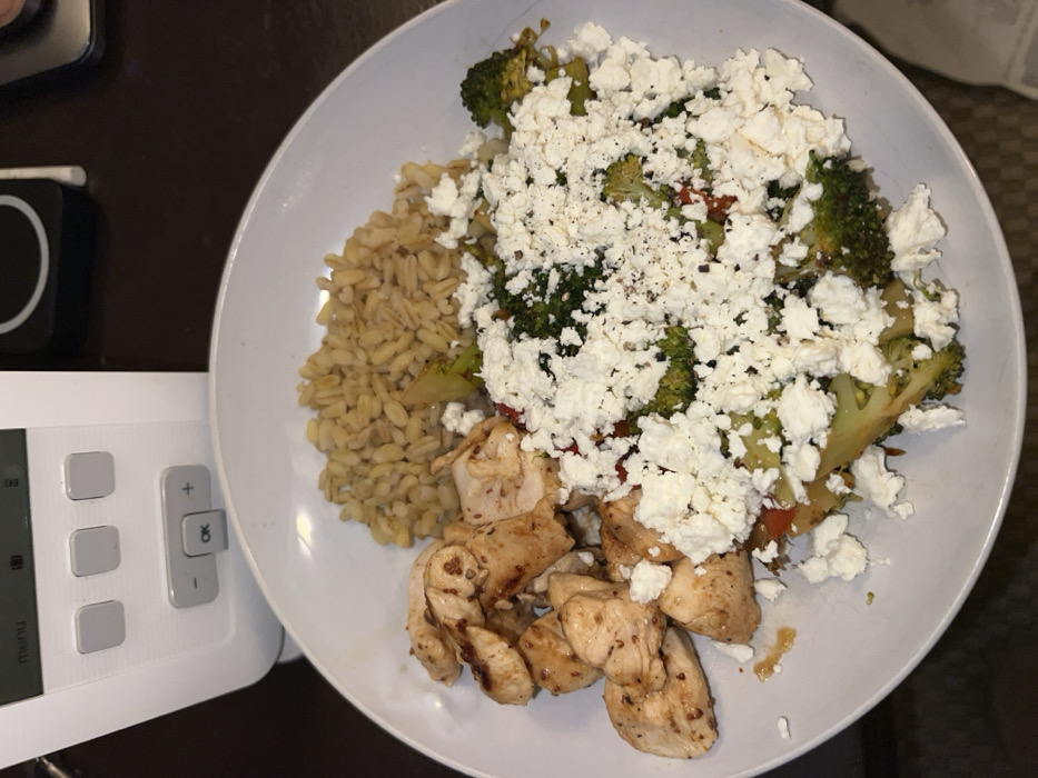 A white plate is laden with a balanced meal. On the left, a mound of brown grains, possibly barley, provides a hearty base. Adjacent to it, seasoned chicken chunks, golden and slightly glistening, promise protein. Crowning the vegetables is a generous layer of crumbled white cheese, likely feta. A sprinkle of black pepper adds a final touch to the healthy dish. Adjacent to the plate, a white electronic device with buttons is visible.
