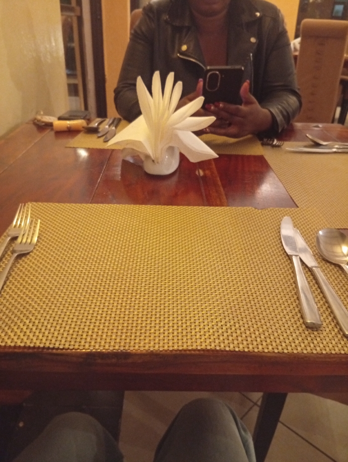 A restaurant table with a brown wood surface and a woven yellow placemat. Silverware, including a fork, knife, and spoon, are placed on the placemat. A napkin holder containing white napkins sits on the table. In the background, a person in a black leather jacket uses a mobile phone. The bottom of the image shows a person's legs in grey pants.