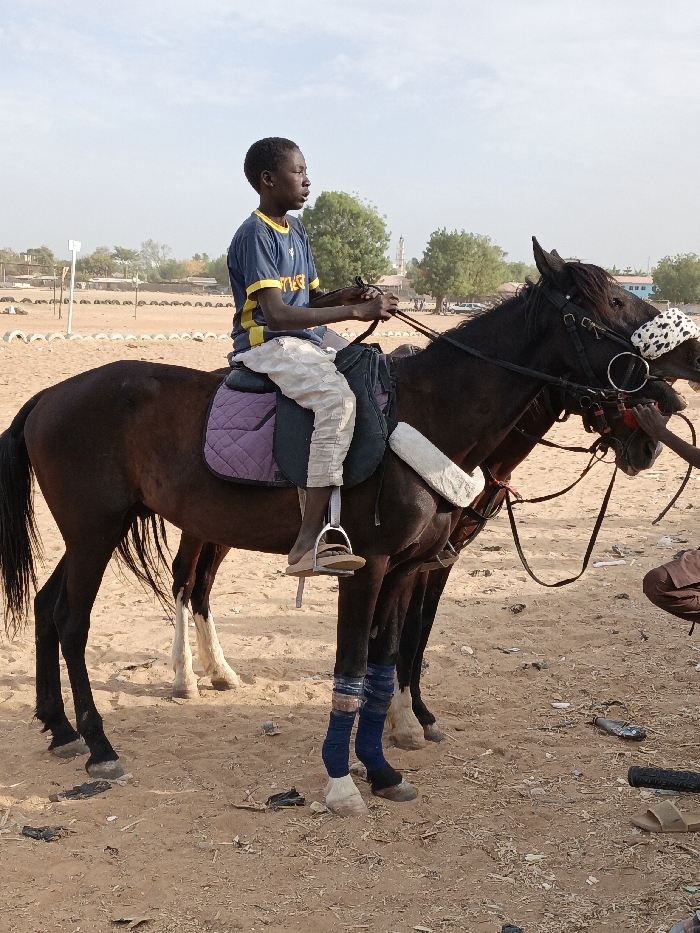 - "A young man with a blue and yellow jersey and light-colored pants sits astride a brown horse" by FM-EzhfF3, licensed under CC BY 4.0