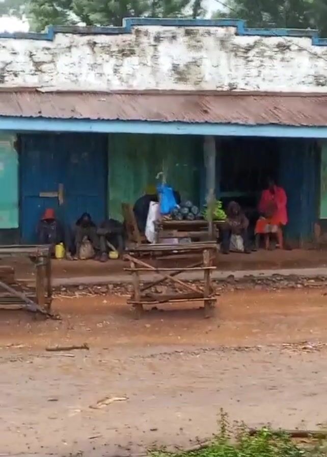 The video depicts a street scene in a village during heavy rainfall. A line of people are sitting under the porch of a building with a dilapidated facade featuring white, blue, and turquoise paint. The ground is muddy and there are wooden structures present. In the background, trees, utility poles, and neighboring buildings can be seen through the rain. The atmosphere appears bleak and wet.