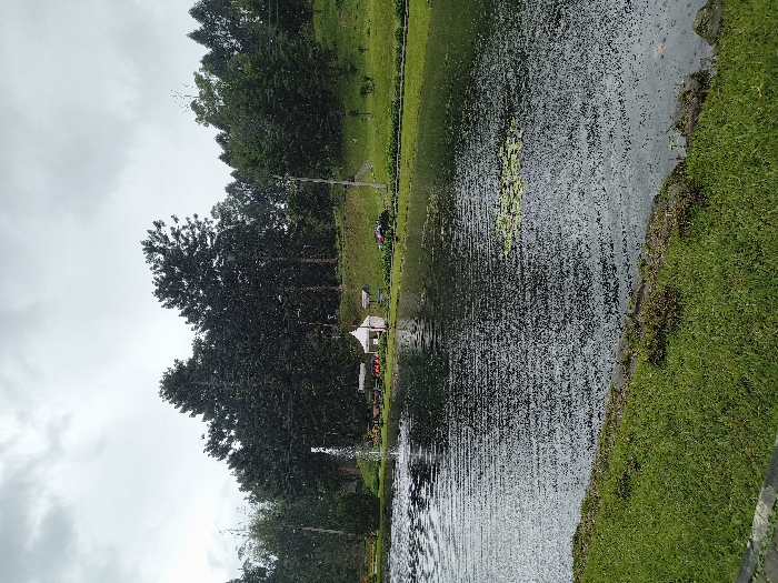 A tranquil scene presents a dark, rippling lake mirroring a cloudy sky. Green grassy banks frame the water's edge. In the background, lush trees and a manicured lawn meet the water. A small white tent is visible amidst the foliage. A fountain sprays water into the air, adding movement to the otherwise still landscape. The view is serene and natural.