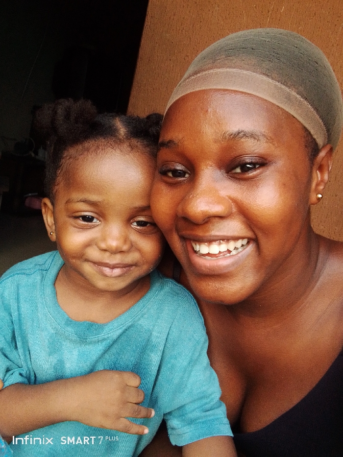 A woman with dark skin and a net cap smiles widely, revealing her teeth. Beside her, a young child with their hair in small buns wears a blue shirt and also smiles slightly. Both individuals are fair-skinned. The background features a textured wall, and the watermark "Infinix SMART 7 PLUS" is visible at the bottom. They are very close to each other and seem to be having a good time.