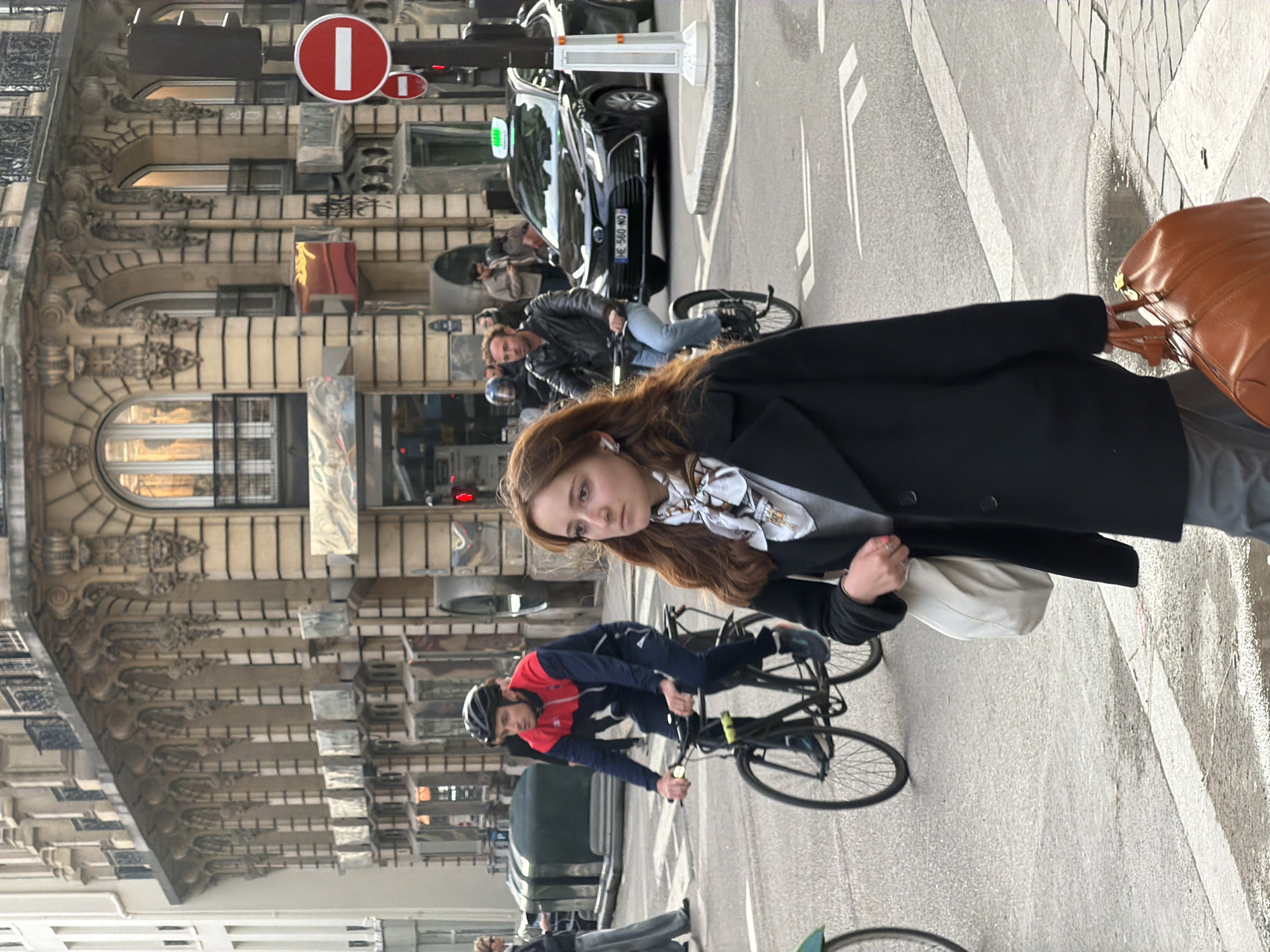 The image depicts a street scene in Paris, France. A woman in a black coat and grey pants carries a brown leather bag and a white purse. She is walking on the sidewalk, with bicycles passing by. A taxi cab is parked nearby. The background includes a detailed Parisian building facade with ornate carvings. A 'no entry' traffic sign is visible on the building.