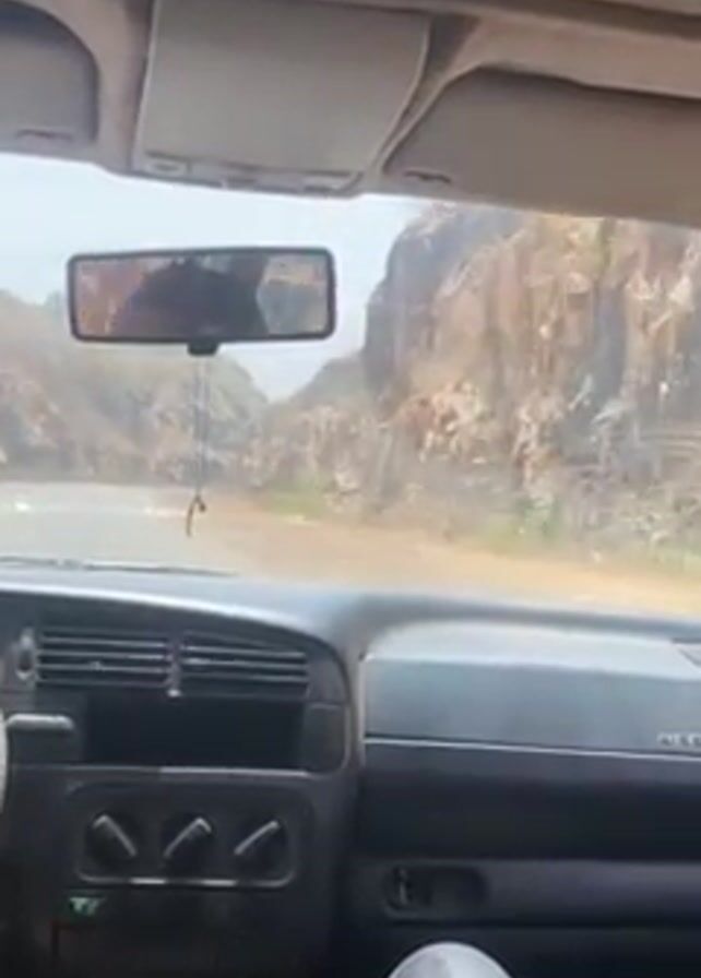 The interior of a car is shown in a point-of-view shot as it travels along an asphalt road. The car's dashboard is visible, along with the steering wheel and a rearview mirror reflecting the driver. Outside the car, the road winds through a canyon with rocky cliffs on either side. The sky is hazy, obscuring distant features. The car is moving forward, giving the impression of driving through the canyon.
