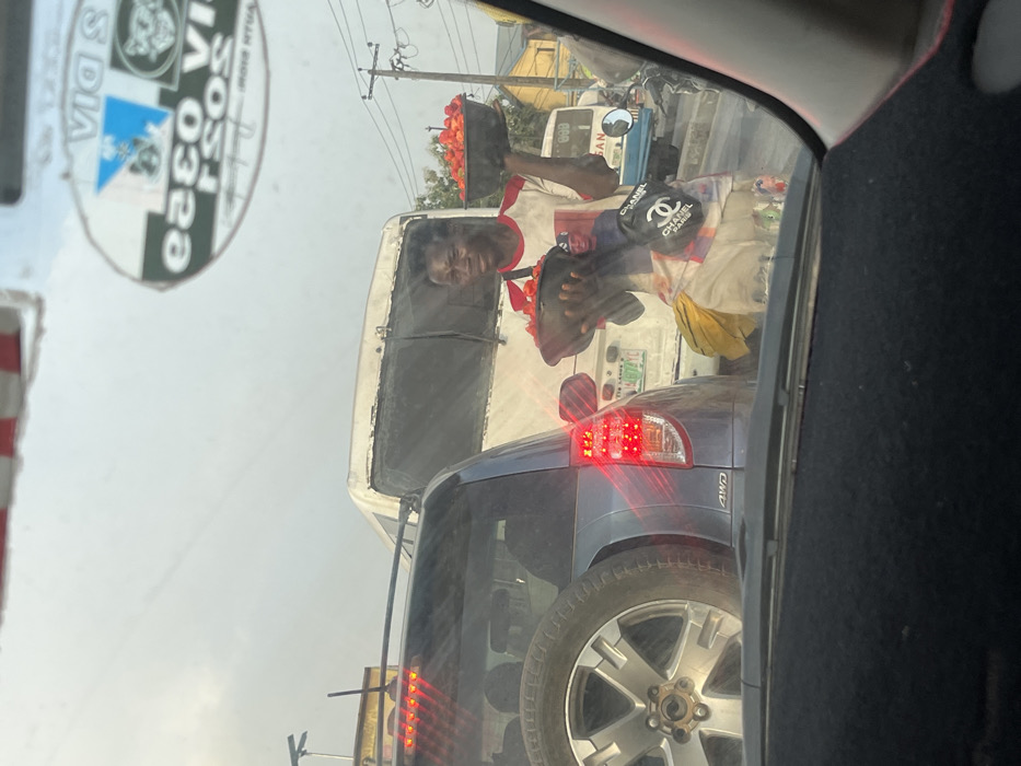 A street vendor stands near traffic, balancing trays of red goods on their head. They wear a white shirt and a Chanel purse rests on their side. Cars are tightly packed, with one blue SUV showing its taillights and a spare tire. Through a car window, signs and other vehicles can be seen, suggesting a busy urban setting.